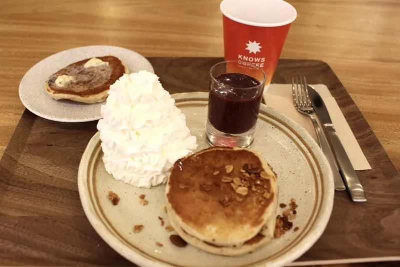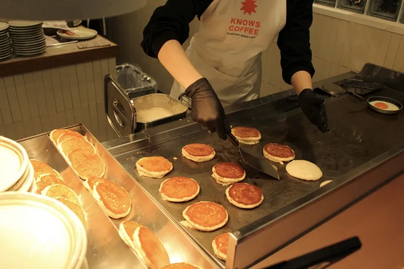 パンケーキは、“パンケーキバー”で1枚1枚丁寧に焼き上げ、香ばしい香りを楽しめる。株式会社KONA'S チーフマネージャーでKNOWS COFFEE ブランド責任者の稲葉友光氏は、「1枚190円(税込)から用意しているので、そのまま食べていただいてもいいですし、トッピングを組み合わせてその日の気分に合わせて楽しんでいただきたい」と口にした。