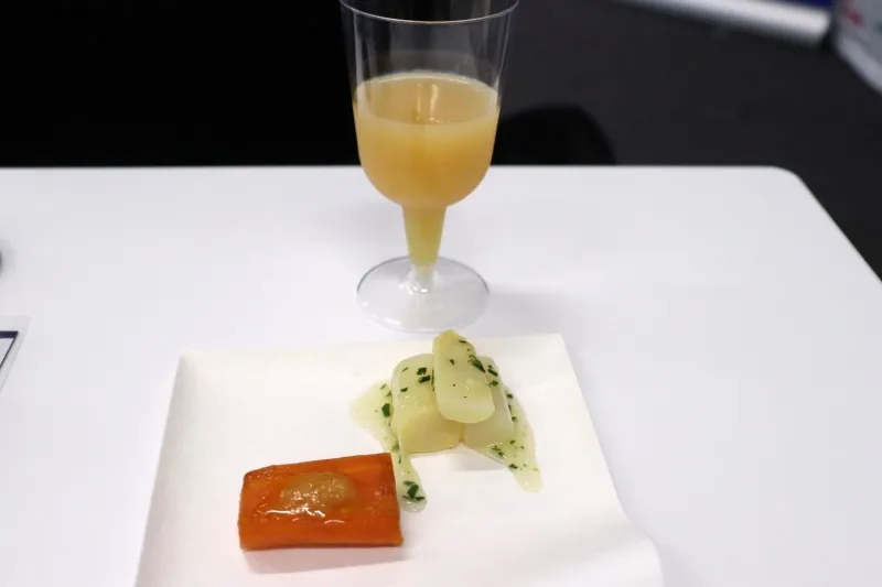 「青の森の蜜でグラッセした雪下人参のキャラメルロースト」は、人参の自然な甘みにりんごのコク深い甘煮が重なり、素材同士が調和した一皿に仕上がっている。煮詰めることで引き出されたりんごの濃厚な旨みが、全体の味わいを引き締めていた。