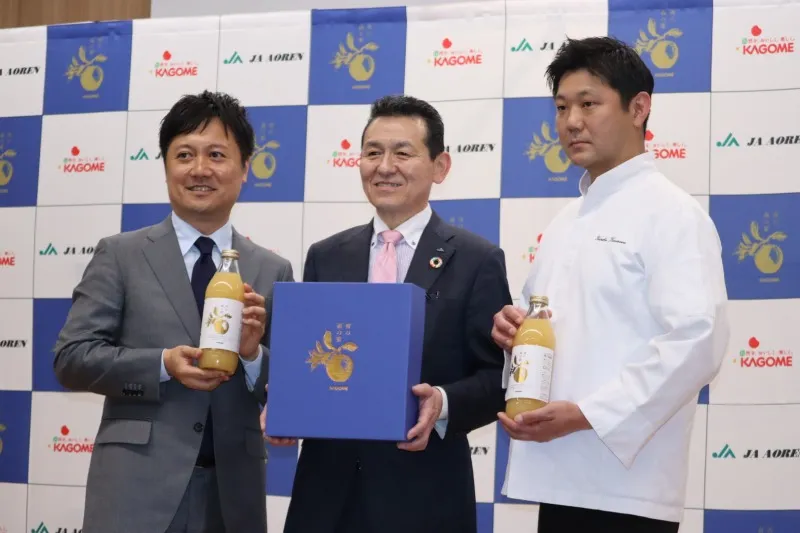 4月27日、カゴメ株式会社は、青森りんご生産者とJAアオレンとの共創から生まれたストレートりんごジュース「青の森の蜜」を発表した。