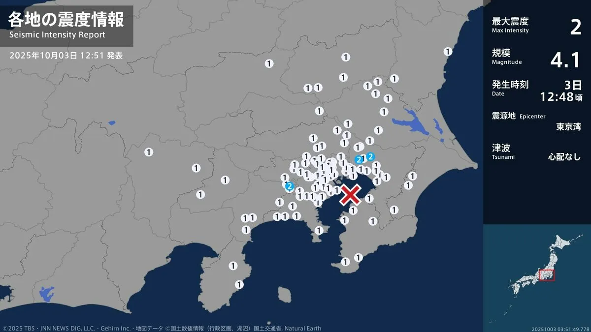 3日午後0時48分ごろ、千葉県、東京都で最大震度2を観測する地震がありました。