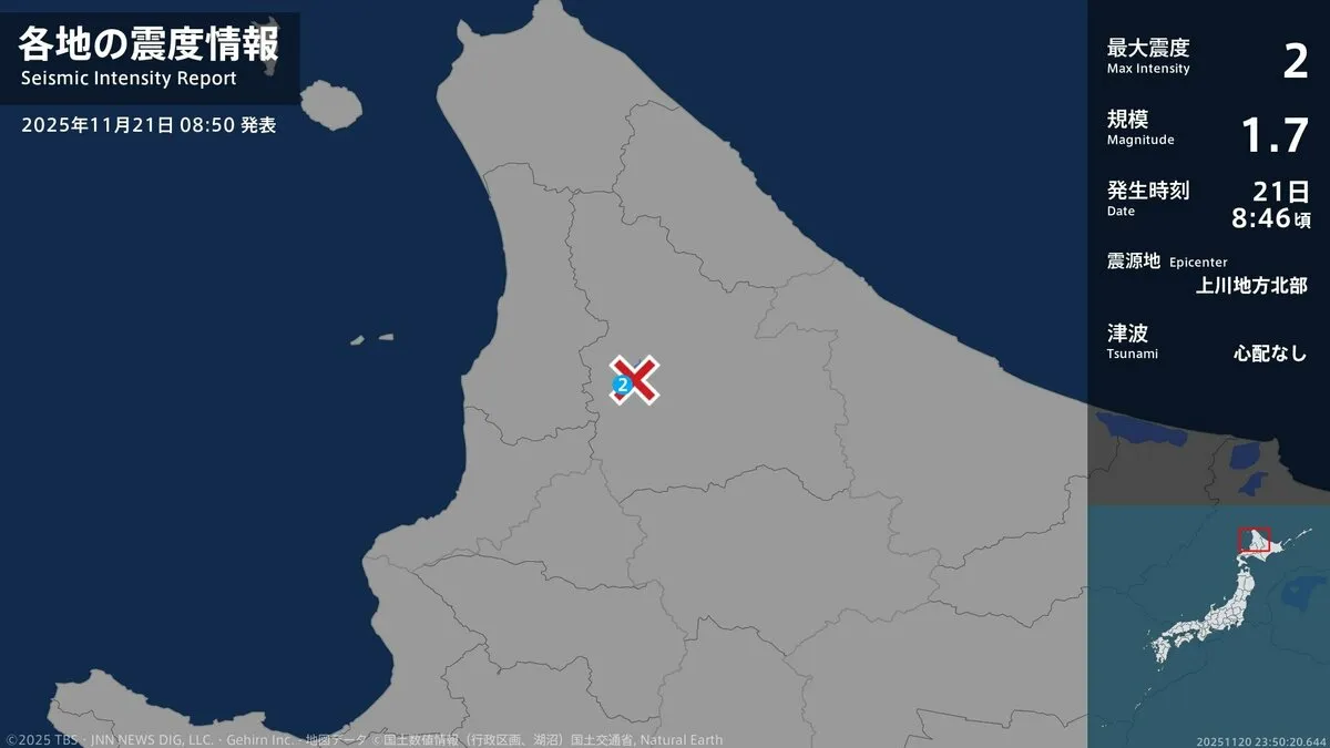 気象庁によりますと、震源地は上川地方北部で、震源の深さはおよそ10km、地震の規模を示すマグニチュードは1.7と推定されます。