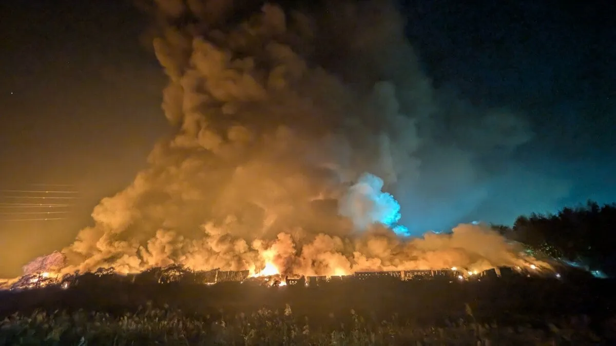警察によりますと、廃プラスチックのリサイクル工場で産業廃棄物などが入っている大量の袋が燃えているとみられていて、西から東へ風が吹いている影響で付近の木にも火が燃え移っているということです。