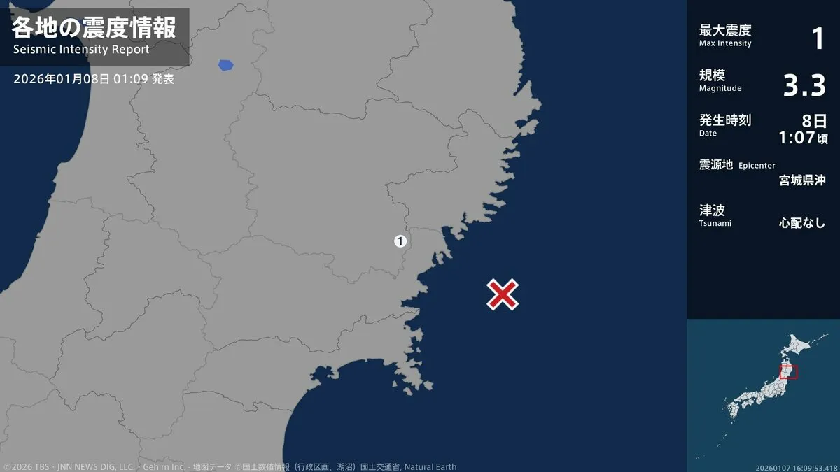 気象庁によりますと、震源地は宮城県沖で、震源の深さはおよそ60km、地震の規模を示すマグニチュードは3.3と推定されます。