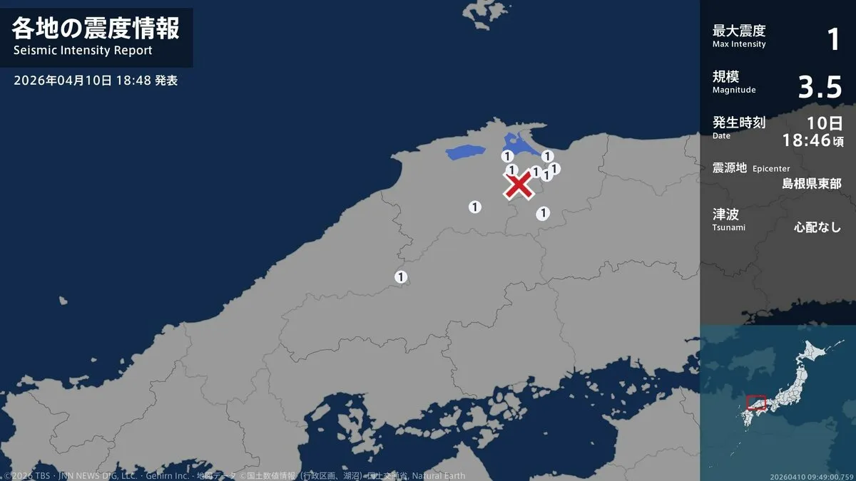 気象庁によりますと、震源地は島根県東部で、震源の深さはおよそ10km、地震の規模を示すマグニチュードは3.5と推定されます。