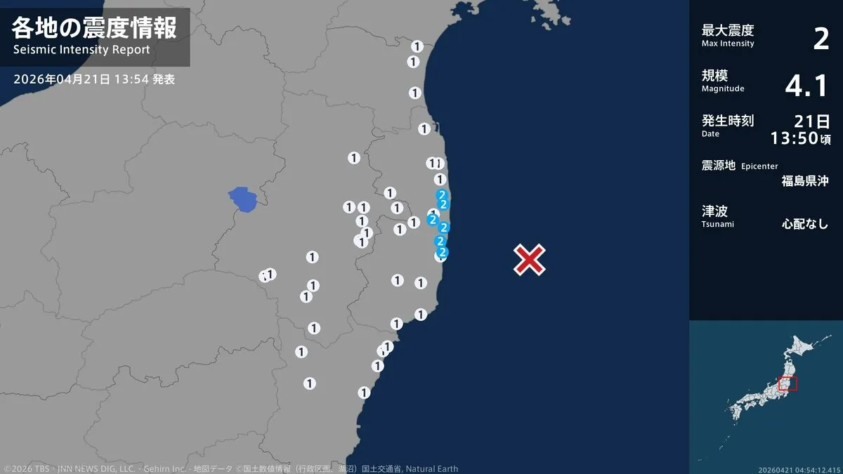 21日午後1時50分ごろ、福島県で最大震度2を観測する地震がありました。