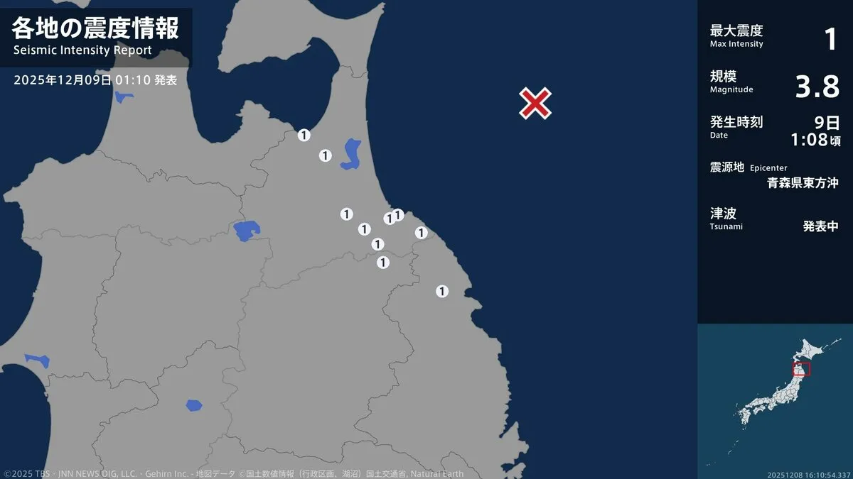9日午前1時8分ごろ、青森県、岩手県で最大震度1を観測する地震がありました。