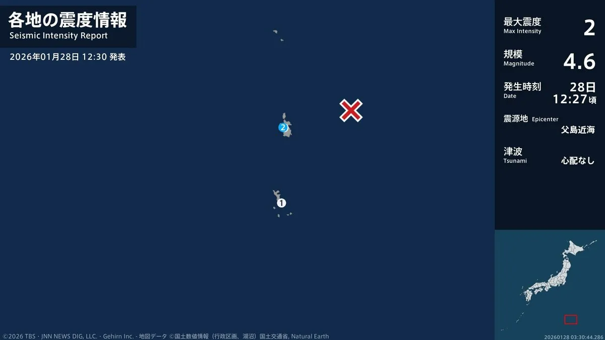 気象庁によりますと、震源地は父島近海で、震源の深さはおよそ20km、地震の規模を示すマグニチュードは4.6と推定されます。